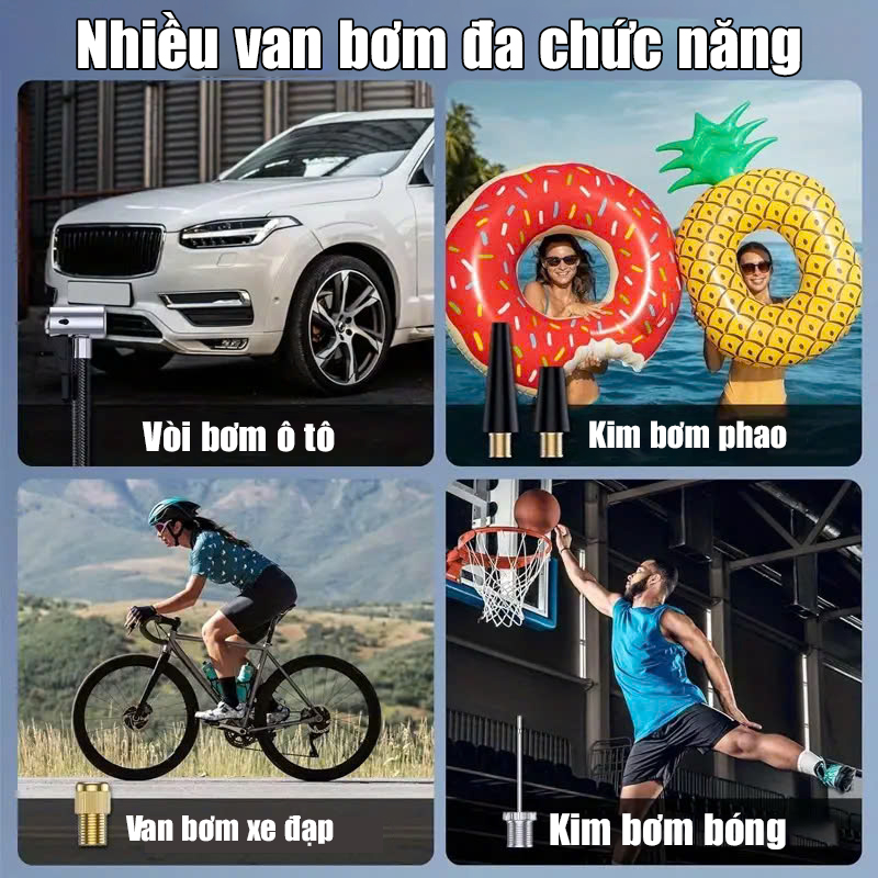 Nhiều đầu bơm dùng cho nhiều loại xe: ô tô, xe tải, xe đạp, bóng…. ( xe ô tô 4-5-7 chỗ ngồi)